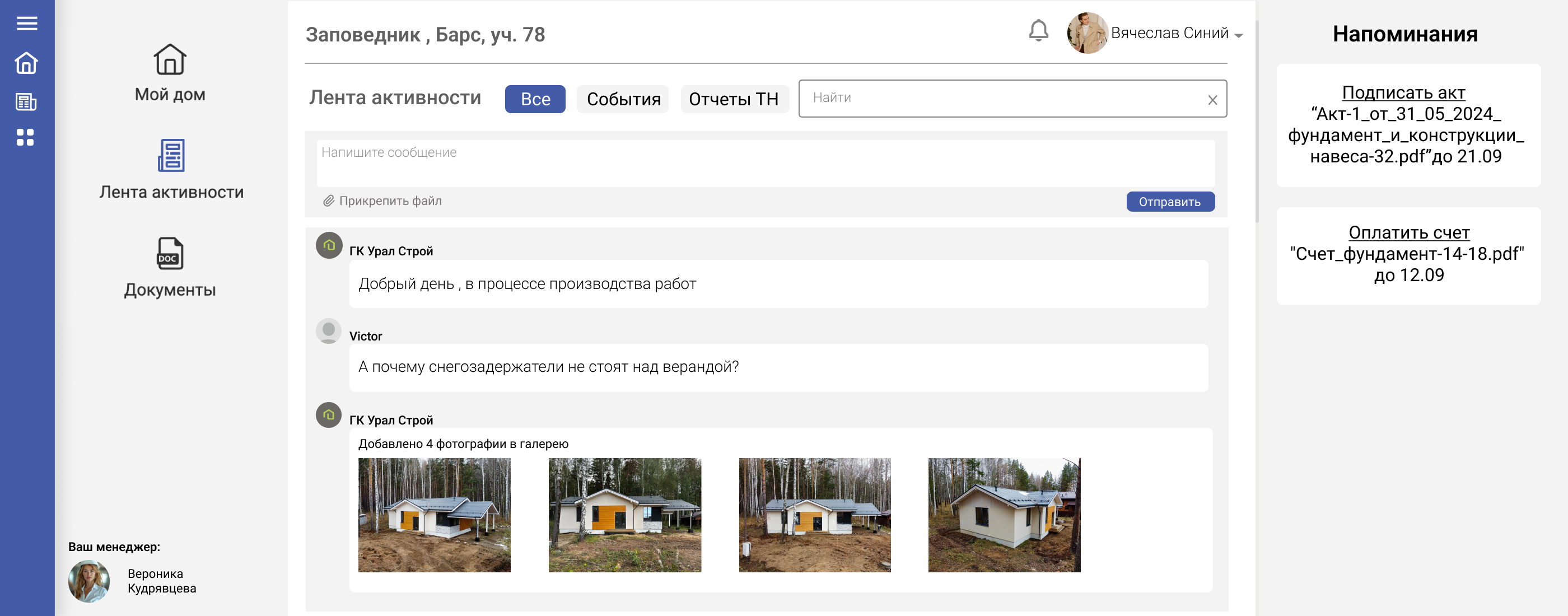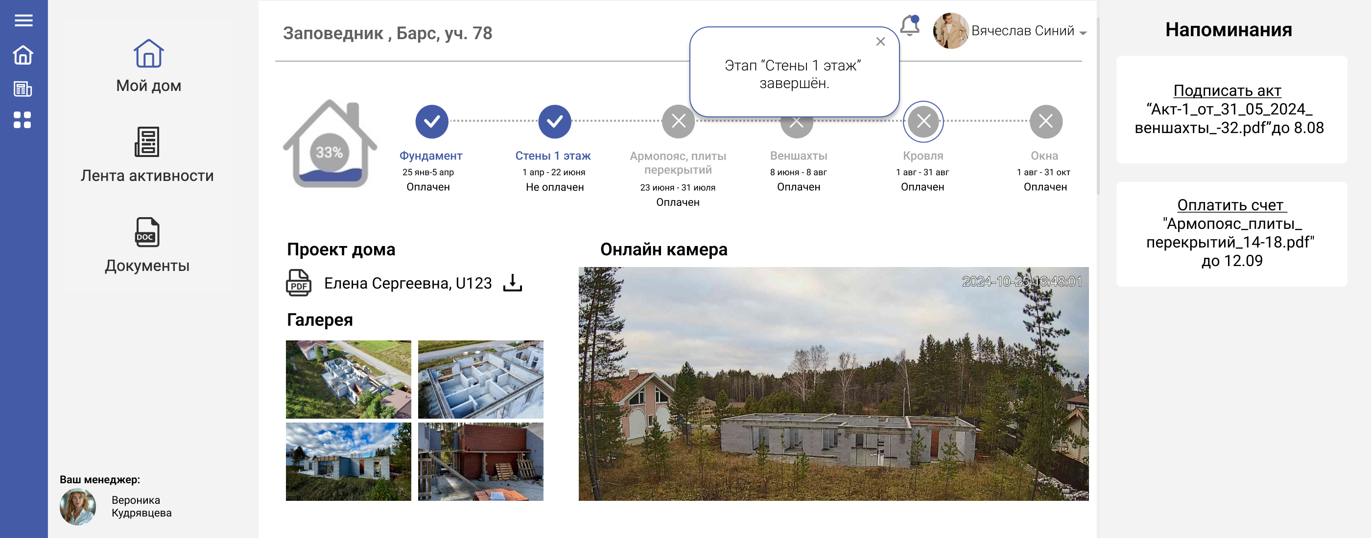 Кроме того, мы предусмотрели личный кабинет для клиентов, который позволяет им удаленно следить за строительными процессами своих домов. Это добавляет уровень прозрачности и доверия, так как клиенты могут в любое время получить актуальную информацию о ходе работ и состоянии своих домов.
